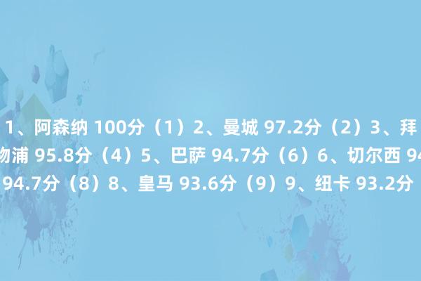 2月27日讯 本赛季欧冠淘汰赛抽签放置,以下为数据网站OPTA对欧冠16强作念的实力名次(括号内为人人名次)。 1、阿森纳 100分(1) 2、曼城 97.2分(2) 3、拜仁 96.5分(3) 4、利物浦 95.8分(4) 5、巴萨 94.7分(6) 6、切尔西 94.7分(7) 7、巴黎 94.7分(8) 8、皇马 93.6分(9) 9、纽卡 93.2分(10) 10、葡体 91.2分(16) 11、马竞 91.1分(17) 12、热刺 90.3分(20) 13、亚特兰大 89.7分(25...