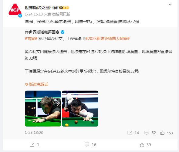 关于他们的退赛,寰宇斯诺克巡回赛官微写谈:“#官宣# 罗尼·奥沙利文、丁俊晖退出#2025斯诺克德国众人赛# 。奥沙利文因健康原因退赛,他原定在64进32轮次中对阵迪伦·埃莫里,现埃莫里将径直晋级32强。丁俊晖原定在64进32轮次中对阵罗斯·缪尔,现缪尔将径直晋级32强”
